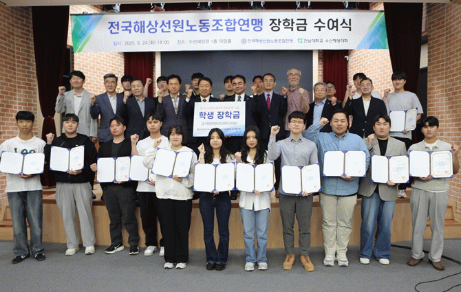 전남대는 지난 6월 24일 여수캠퍼스 수산해양관 1층 덕암홀에서 김용민 여수부총장, 서호영 수산해양대학장 등 보직자들과 선원노련 박성용 위원장 등이 참석한 가운데 ‘전국해상선원노동조합연맹 장학증서 및 장학금 전달식’을 가졌다.