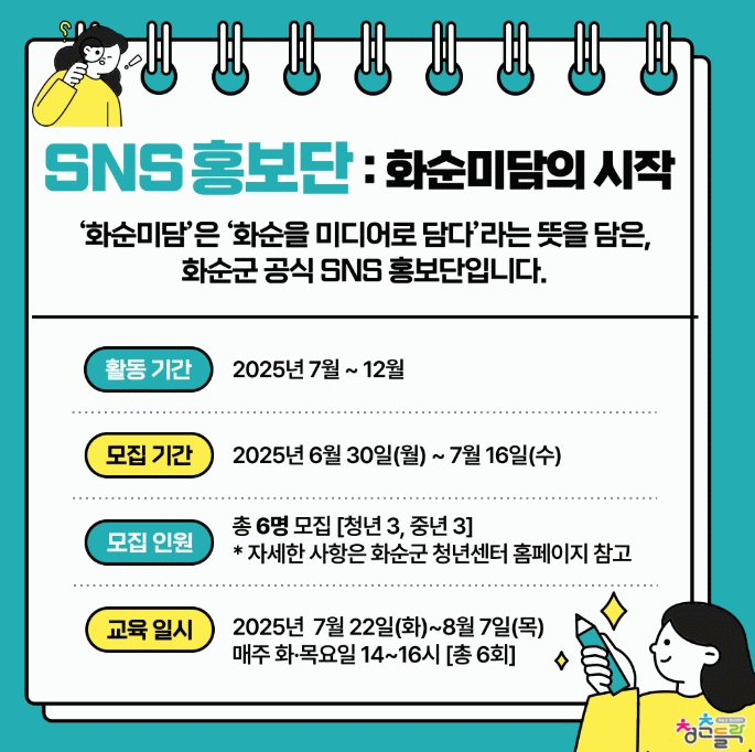 홍보단은 청년 3명, 중년 3명으로 구성되며, 인스타그램·페이스북·유튜브·블로그 등 SNS를 활발히 운영 중이거나, 이에 관심 있는 화순군민이면 누구나 지원할 수 있다.