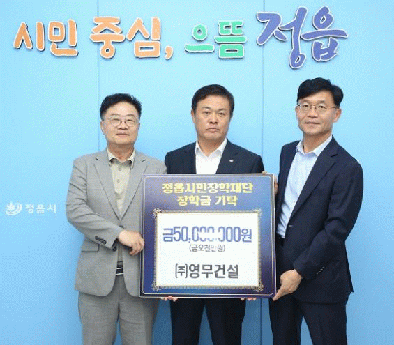 기탁식은 지난 6월 30일 정읍시청에서 열렸다. 영무건설 측에서는 김동월 대표이사와 박치원 전무가 참석했다. 장학금을 전달받은 이학수 시장은 따뜻한 나눔에 깊은 감사의 뜻을 전했다.