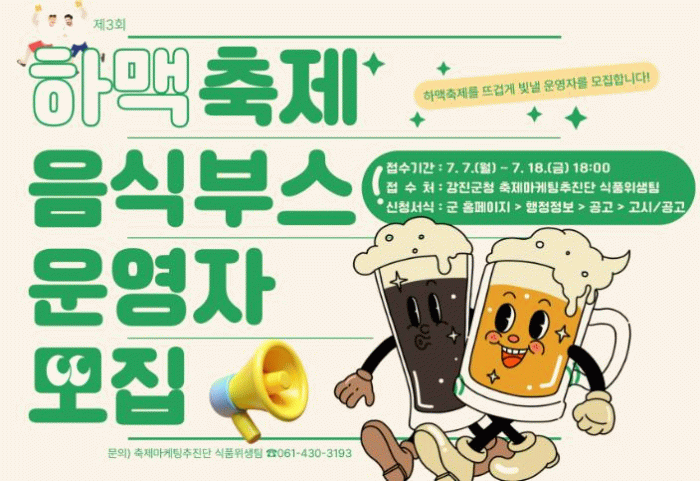 강진군은 오는 8월 28일부터 30일까지 강진종합운동장 일원에서 열리는 ‘제3회 강진하맥축제’를 앞두고, 축제의 풍미를 더할 음식부스 운영자를 공개 모집한다고 밝혔다.