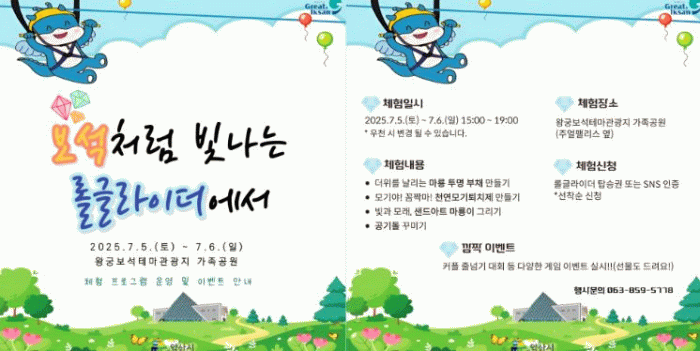 이번 행사는 올해 새롭게 개장한 롤글라이더를 알리기 위해 기획된 행사로, 왕궁보석테마관광지 내 가족공원에서 롤글라이더와 연계한 체험 프로그램이 진행된다.