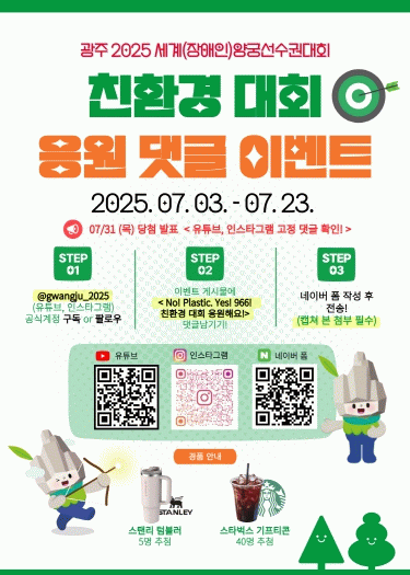 이번 이벤트는 대회 공식 사회관계망 계정, 유튜브 및 인스타그램 을 통해 ‘친환경 대회 응원 댓글 달기’로 진행된다. 참여 방법은 대회 공식 계정을 구독(또는 팔로우)하고, 이벤트 게시물에 응원 댓글을 작성한 후 네이버 폼에 제출하면 된다. 이벤트 참여자 중 추첨을 통해 텀블러와 커피쿠폰을 증정한다.