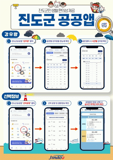 진도군 공공앱은 진도군 전역과 읍면별 실시간 강우량 정보를 시각화해 시간별 누적량, 전일, 금일, 월간, 연간 강우량을 쉽게 확인할 수 있도록 개선했으며, 진도군 관내에서 운항 중인 항로의 운항 시간, 실시간 선박 위치, 결항 정보까지 확인할 수 있다.
