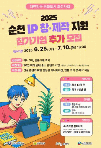 한편, ‘순천 IP 창·제작 지원 사업’은 대한민국 문화도시 조성사업의 일환으로 순천시와 (재)순천문화재단이 공동 추진하며, 자세한 내용은 순천문화재단 누리집 또는 e나라도움 공모사업목록에서 확인할 수 있다.