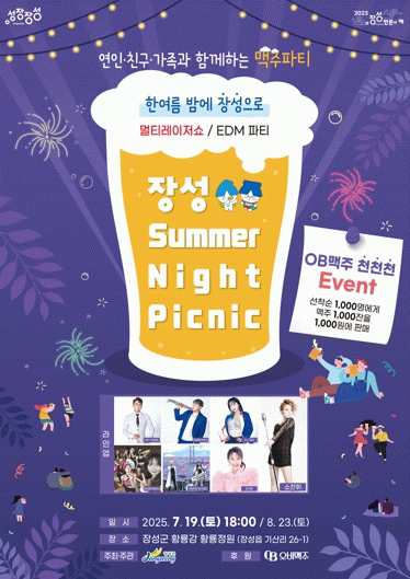 한편, ‘장성의 중심’ 황룡강도 더위에 지친 사람들을 위한 선물을 준비했다. 이달 19일 오후 6시 황룡정원 야외무대에서 ‘장성 썸머나잇 피크닉’이 열린다. 폭발적인 가창력을 지닌 가수 소찬휘를 필두로 더위에 지친 사람들에게 활력소가 될 음악을 들려준다. 선착순 1000명에게 맥주 1000잔을 1000원에 판매하는 행사도 연다.