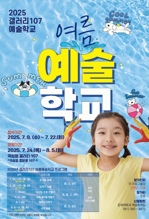 예술학교는 매년 방학 기간에 운영하는 교육 프로그램으로 갤러리 107을 지역 문화예술의 중심지로 발전시키고, 지역 주민들에게는 예술을 즐기는 기회와 예술적 성취감을 제공하는 것이 목적이다.