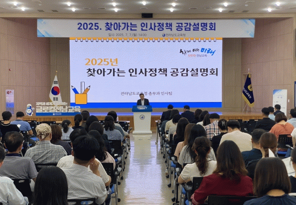 전남교육청은 7일(본청), 9일(전남교육청교육연수원), 11일 (순천만생태문화교육원) 권역별로 ‘2025 찾아가는 인사정책 공감설명회’를 개최한다고 밝혔다.