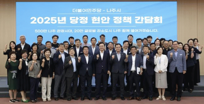 이날 간담회에는 윤병태 시장을 비롯해 신정훈 국회의원, 이재남 시의회의장, 민주당 소속 도의원, 시의원과 지역위원회 당직자 및 보좌진, 강상구 부시장, 간부공직자 등 70여 명이 참석했다.