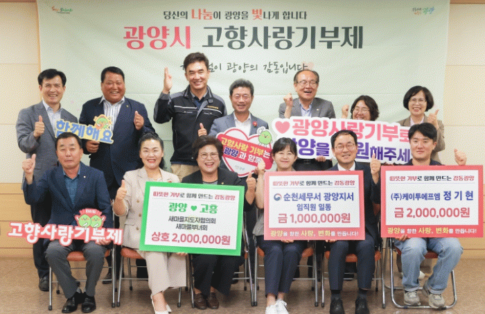 순천세무서 광양지서 임직원들은 광양의 발전을 응원하는 마음으로 기부에 동참했으며, 지역 기업인 ㈜케이투에프엠도 광양에 대한 애정을 담아 고향사랑 실천에 앞장섰다. 아울러 광양시와 고흥군 새마을지도자협의회 및 새마을부녀회도 상호 기부를 통해 지역 간 우의를 다지고 공동체 정신을 실현했다.