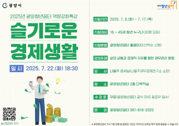 강의는 직장인 청년들도 부담 없이 참석할 수 있도록 저녁 시간대에 진행된다. 참여는 선착순 30명까지 가능하며, 7월 17일까지 광양청년꿈터 홈페이지에서 신청할 수 있다. 자세한 사항은 광양청년꿈터에 문의하면 된다.