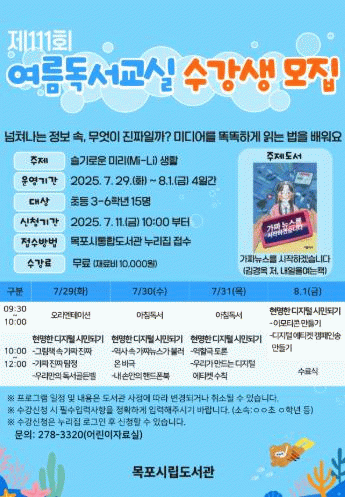 참가 신청은 오는 7월 11일부터 목포시통합도서관 누리집을 통해 가능하며, 자세한 사항은 목포시립도서관으로 문의하면 된다.
