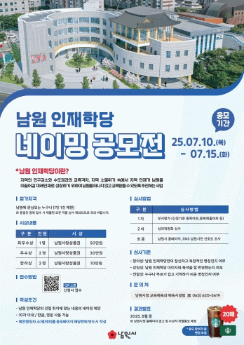 접수기간은 7월 10일부터 15일까지이며, QR코드를 스캔하여 신청서 작성 후 제출하면 된다. 당선작에는 최우수분야 50만원을 포함하여 총 130만원의 남원사랑상품권을 수여할 예정이며, 기타 자세한 사항은 남원시 홈페이지에서 확인할 수 있다.