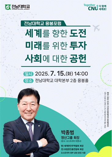 용봉포럼의 첫 연사인 영산그룹 박종범 회장의 강연주제는 ‘세계 향한 도전, 미래를 위한 투자, 사회에 대한 공헌’이다.