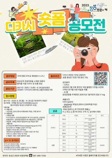 공모전에 관한 자세한 사항은 장성군 누리집 공지사항, ‘장성 방문의 해’ 누리집에서 확인하거나 장성군 관광과로 문의하면 된다.
