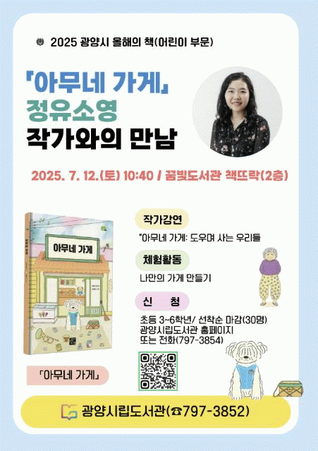 정유소영 작가는 ‘도우며 사는 우리들’을 주제로 작품에 담긴 메시지를 어린이 눈높이에 맞춰 전달하고, ‘나만의 가게 만들기’ 체험활동을 통해 어린이들과 가까이서 소통하는 시간을 가질 예정이다.