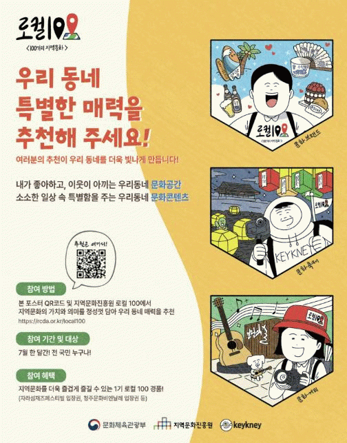 추천 대상은 복합문화공간, 전통시장 등 지역에 기반을 둔 특색 있는 문화자원과 축제, 공연, 체험형 콘텐츠, 지역 브랜드 등의 문화콘텐츠다. 추천은 7월 31일까지 공식 누리집 또는 홍보 포스터의 QR코드를 통해 가능하며, 참여자에게는 추첨을 통해 삼성 갤럭시 탭 S10 FE, 갤럭시 워치 7, 지역축제 및 비엔날레 관람권, 아이스아메리카노 등 다양한 경품이 제공된다.