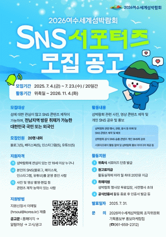서포터즈는 이달 23일까지 신청을 받아 SNS 운영 수준, 콘텐츠 제작 능력, 서포터즈 활동 계획 등 분야별 평가 후 최종 선발할 예정이다. 자세한 사항은 섬박람회 공식 누리집에서 확인할 수 있다.