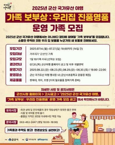 가족 보부상과 별별부스 신청서 및 자세한 사항은 군산시청 누리집(행사안내)을 참고하거나 군산 국가유산 야행 대행사로 문의하면 된다.