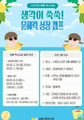 정성주 김제시장은 “이번 프로그램은 초등학생들의 문해력 향상과 사고력 성장을 돕기 위해 기획됐으며, 재미있고 유익한 활동으로 즐거운 독서교실이 되길 바란다.”고 전했다.