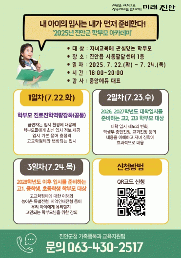 학부모 아카데미는 일자별로 나뉘어 ▲1일 차 학부모 진로 진학 역량강화를 위한 공통과정 ▲2일 차 2026, 2027학년도 대학입시를 준비하는 고2, 고3 학부모 대상 ▲3일 차 2028학년도 이후 입시를 준비하는 초등학생부터 고1 자녀를 둔 학부모를 대상으로 운영된다.