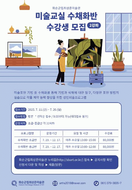 강의는 7월 23일부터 12월 17일까지 매주 수요일 화순군립최상준미술관 교육창작실에서 진행된다. 초급반은 오후 1시부터 3시까지, 중급반은 오전 10시부터 12시까지 각각 운영되며, 반별로 총 22회씩 구성된다. 수업은 수채화 분야에서 활동해 온 설상호 강사가 맡아 체계적인 지도를 제공할 예정이다.