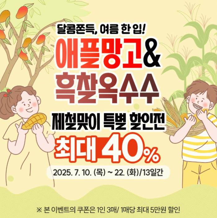 ‘달콤쫀득, 여름 한입!’이라는 슬로건 아래 열리는 이번 기획전에서는 애플망고와 흑찰옥수수를 최대 40% 할인된 가격으로 선보인다.