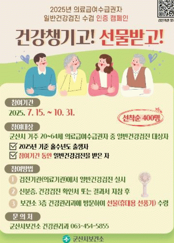 참여 대상은 군산시에 거주하는 20~64세 의료급여수급권자 중 홀수년도 출생자로 캠페인 기간 내(7월 15일~10월 31일) 일반건강검진을 완료한 시민이다.