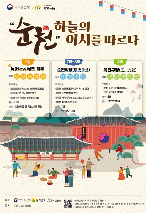 이번 프로그램은 ‘순천, 하늘의 이치를 따르다’라는 주제로, ▲순천학당 ▲ 뉴(New)생의 하루 ▲옥천구경 등 총 3가지 테마로 구성돼 시민들이 직접 보고, 듣고, 체험하며 유산의 가치를 느낄 수 있도록 기획됐다.