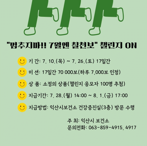 걷기 챌린지에 대한 더욱 자세한 내용은 보건사업과(063-859-4915, 4917)로 문의하면 된다.