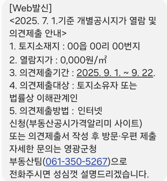 개별공시지가의 열람 공고일 및 결정·공시일에 맞춰 1월 1일 기준 개별공시지가는 3월과 4월에, 7월 1일 기준 개별공시지가는 9월과 10월에 각각 안내 문자가 전송된다.