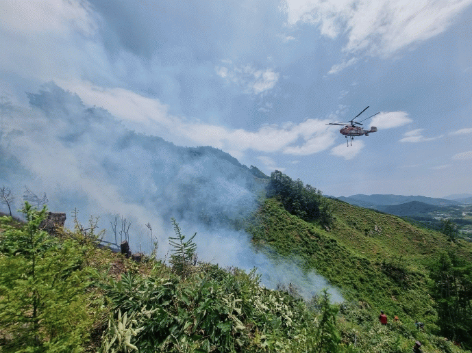 산림당국은 산불예방전문진화대 등 전문 지상진화인력과 공무원 등 총 67명과 산불진화헬기 1대(산림청 소속)를 투입하여, 산불 확산 차단을 위한 방화선을 구축하고 신속하게 진화작업을 전개했다.