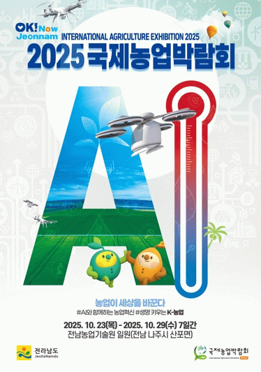 2025국제농업박람회는 오는 10월 23일부터 29일까지 나주 산포면 전남도농업기술원 일원에서 개최된다. ‘AI와 함께하는 농업혁신, 생명 키우는 K-농업’를 주제로 미래 농업의 비전과 혁신 기술을 선보일 예정이다.