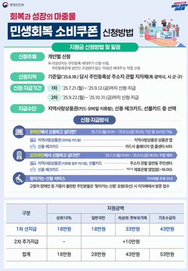 1차분 민생 소비쿠폰 지급은 모든 시민에게 보편적으로 지급되며, 소득수준 및 사회적 배려 계층 여부에 따라 △기초수급자 43만 원 △차상위계층 및 한부모가정 33만 원 △일반시민 18만 원으로 차등 적용된다.