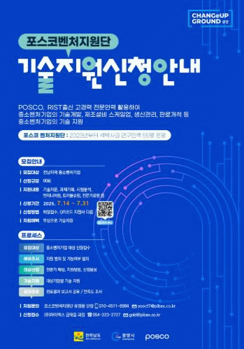벤처지원단 기술지원사업 신청은 7월 14일부터 31일까지 이메일 또는 QR코드를 통해 접수할 수 있으며, 자세한 내용은 광양시 누리집 및 공고문을 통해 확인 가능하다.