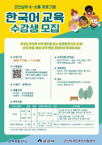 접수는 군산시청과 군산외국인주민지원센터로 전화 또는 방문해 신청하거나, 포스터의 QR 부호(코드)를 통해 온라인으로 접수해도 된다.