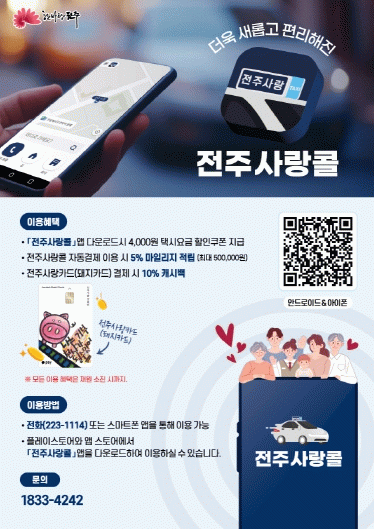 또한 전주사랑콜 앱을 다운로드한 이용자에게 4000원의 택시요금 할인쿠폰을 지급하고, 자동결제로 택시 이용시 최대 50만 원까지 택시요금의 5%를 마일리지로 적립해 택시요금 결제 시 쿠폰(1000원~4000원)으로 교환 사용할 수 있는 상시 이벤트도 추진된다.