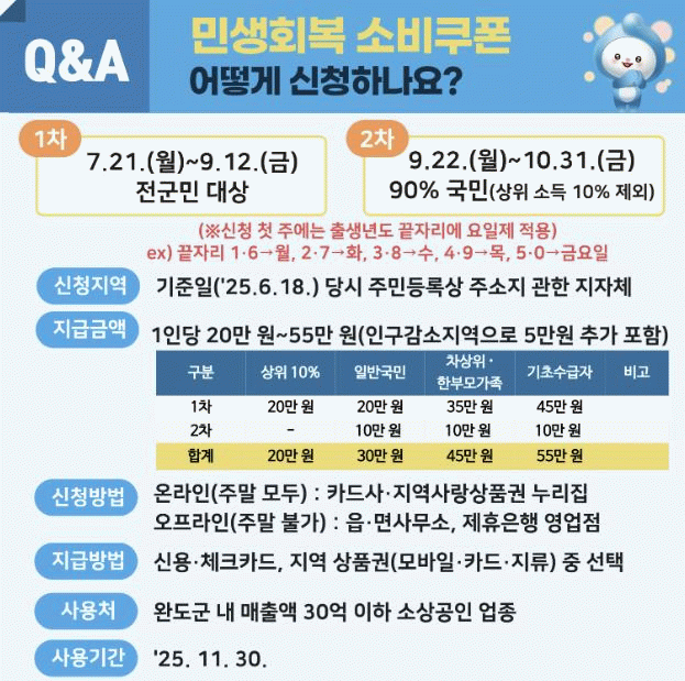 소비 쿠폰은 1차와 2차로 나눠 단계적으로 지급되며 인구 감소 지역인 완도군은 5만 원이 추가돼 1차로 ▲일반 군민 20만 원 ▲차상위 계층·한부모 가족 35만 원 ▲기초 생활 수급자 45만 원이 지급된다.