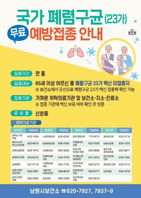 이에 남원시는 64세 시민을 대상으로 폐렴구균 13가 접종을 무료로 지원하고 있으며, 65세가 되면 폐렴구균 23가 국가 무료 접종을 추가로 실시하여 폐렴구균 감염증과 합병증 예방 효과를 더 높이기 위해 노력하고 있다.