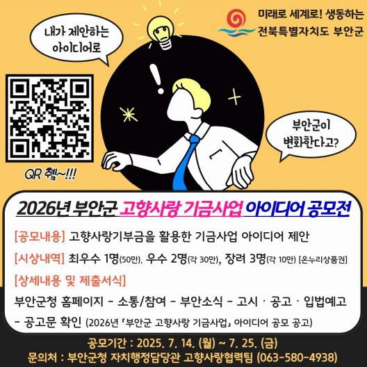 권익현 부안군수는 “고향사랑기부제는 단순한 기부 유치가 아니라, 지역 문제를 주민과 함께 고민하고 해결하는 참여 플랫폼”이라며 “많은 분들이 참신하고 실효성 있는 아이디어를 제안해주시길 기대한다”고 말했다.