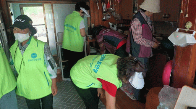 지난 15일에는 회원 20여 명이 동진면을 방문하여 홀몸 어르신 댁의 가사 점검은 물론 집 청소 및 세탁세제와 간식 등 일상생활에 꼭 필요한 물품들을 전달하여 연일 계속되는 폭염 속 어르신의 편안하고, 건강한 생활을 도왔다.
