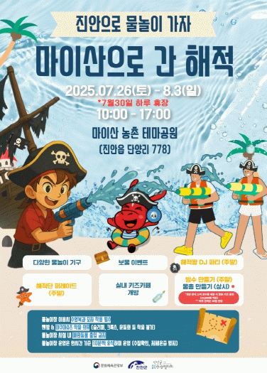 진안 마이산 농촌테마공원에서 오는 7월 26일부터 8월 3일까지 8일간(7월 30일 휴장)『마이산으로 간 해적!』 물놀이장 행사가 개최된다.