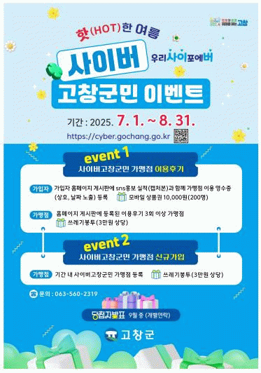 사이버고창군민이 가맹점 이용 후기를 사이버 고창군민 홈페이지에 등록하거나 관내 업체가 이벤트 기간 내에 가맹점으로 신규 등록하는 방식으로 참여할 수 있다.