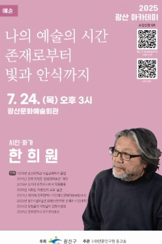 박병규 광산구청장은 “지역 대표 거장 한희원 작가와 함께하는 7월 광산아카데미는 무심코 지나쳤던 나만의 ‘예술의 시간’을 깨닫고, 새기는 시간이 될 것”이라며 “한희원 작가와 많은 시민이 함께 일상 속 예술, 예술 속 일상을 이야기하는 자리가 되길 기대한다”고 밝혔다.