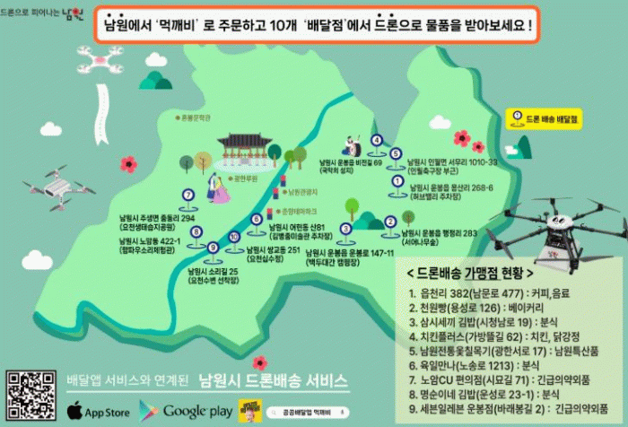 이번 사업은 드론을 활용한 식음료 및 보건관련 의약품 배송 서비스로, 남원시민과 관광객은 배달앱 ‘먹깨비’를 통해 드론배송이 가능한 배달점(10개소)에서 원하는 물품을 주문할 수 있으며, 11월 28일까지 매주 금·토·일요일 배송이 이뤄진다.