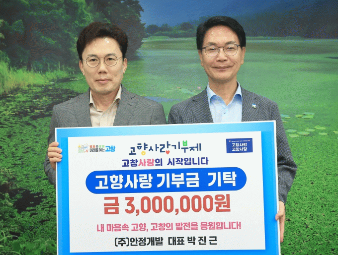 심덕섭 고창군수는 “박진근 대표의 따뜻한 마음에 깊이 감사드린다”며 “소중한 기부금은 고창의 미래에 큰 보탬이 될 것”이라며 “기부자의 뜻에 따라 지역 주민을 위한 다양한 분야에 소중히 활용하겠다”고 밝혔다.