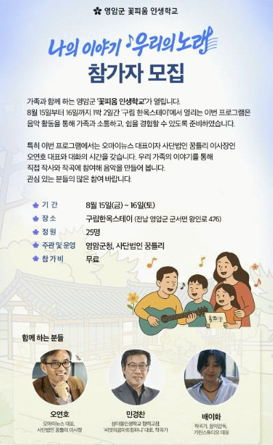 1박 2일 동안 총 25명의 인생학교 참가자들은, 구림한옥스테이에서 △오연호 오마이뉴스 대표 만남 △민경찬·배이화 음악감독과 노래 작사·작곡 △가족 레크리에이션 등 다채로운 프로그램에 함께 한다.
