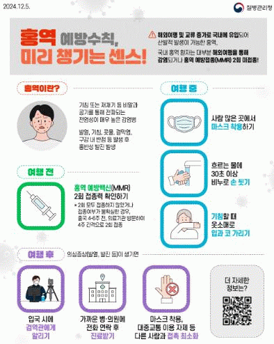 정광선 전남도 보건복지국장은 “여름방학과 휴가철을 맞아 해외여행객이 늘어나는 시기인 만큼 출국 전 홍역 예방접종을 완료하고, 여행 기간 손씻기, 마스크 착용 등 호흡기 감염병 예방수칙을 반드시 지키길 바란다”고 당부했다.