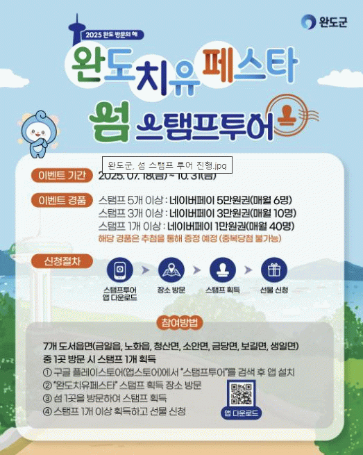참여 대상은 완도군 외 타 지역에 주소지를 두고 있는 관광객이며, 참여 방법은 모바일 앱 ‘스탬프 투어’를 설치한 후 앱 내에서 ‘완도 치유 페스타 섬 스탬프 투어’를 선택하면 된다.