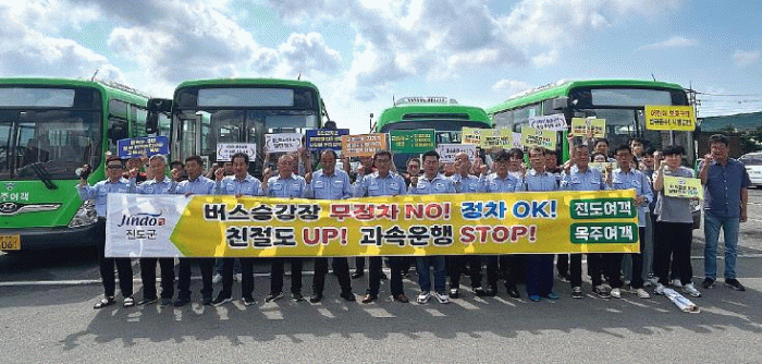 군이 지난해 7월부터 시행하고 있는 농어촌버스 무료 운행 정책이 군민에게 큰 호응을 얻고 있으나 일부 노선에서 발생하는 불친절, 규정 속도 미준수 등의 문제를 개선하기 위해 진도·옥주여객 임직원과 함께 운동(캠페인)에 나섰다.