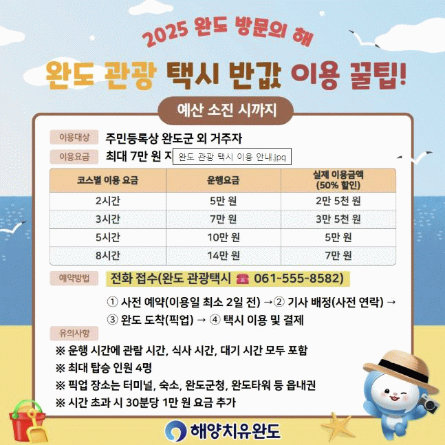 관광 택시 이용을 희망하는 관광객은 이용일 2일 전까지 완도 관광택시에 전화로 사전 예약해야 한다.